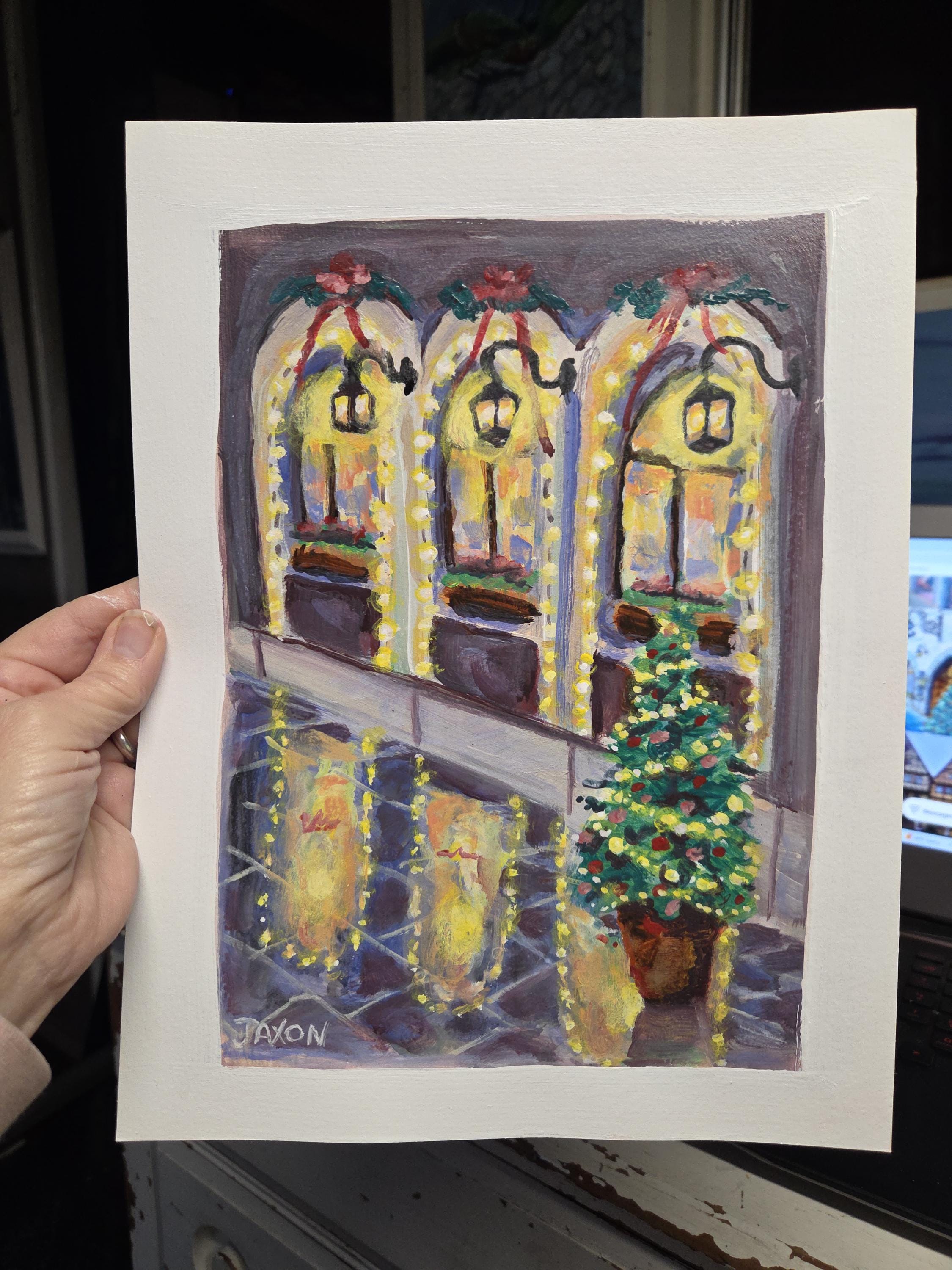 Landscape of three arched windows decorated with lights and bows for Christmas!